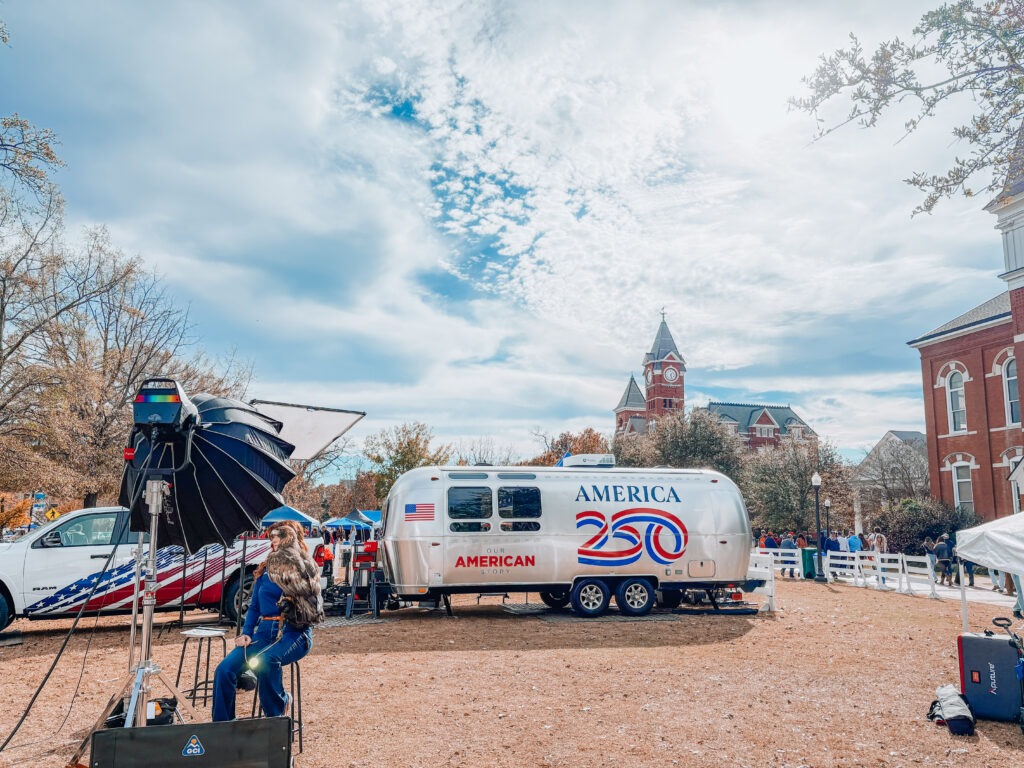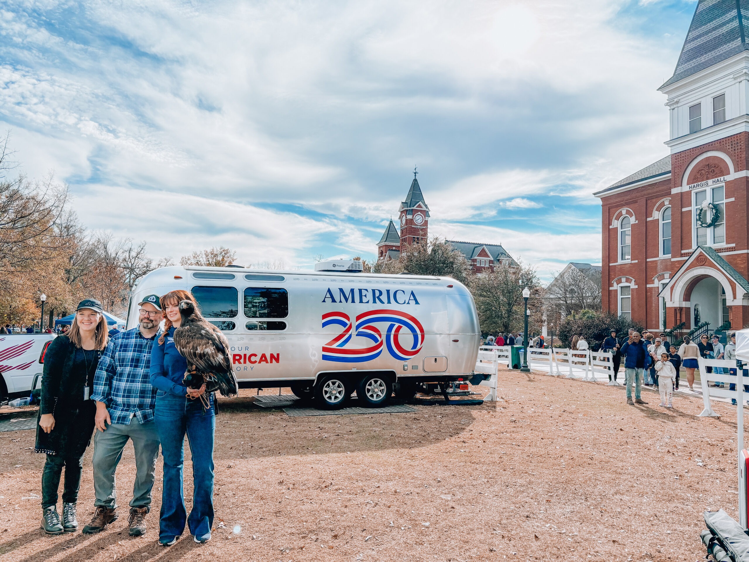 America250 Alabama participated in the Iron Bowl, along with America250’s “Our American Story.” The A250 Airstream recorded stories from people at the tailgate (even from the Auburn eagle!) and handed out “America’s Kickoff” commemorative buttons. The America250 logo was prominently displayed on the field.